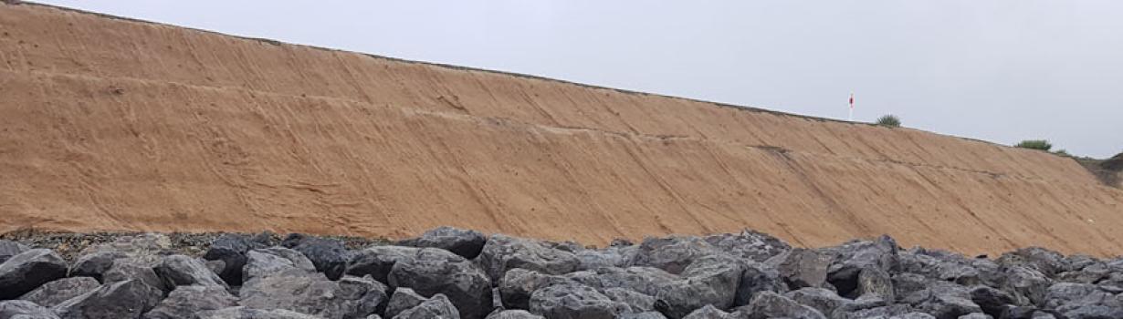 The design solution accepted by the client and installed by SouthRoads was a 9 m high Miragrid reinforced structure to reinstate the eroded embankment. Further protection consisting of 2 m thick armour rock at the toe extending 1 m below the lowest historic beach level. The slope was constructed using bidim A64 geotextile, TenCate Miragird GX 100, a top layer of BioMac Coir mat with rip-rap at the toe.