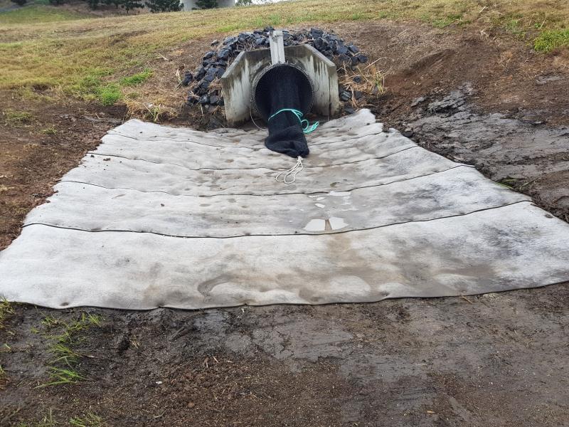 The 300 m2 of CC5 were laid longitudinally along the road edge and anchored using 300 mm U pins at the crest, adjoined to the bitumen seal. Adjacent rolls were joined by using stainless steel collated screws. The Concrete Canvas was then hydrated using on site water cart resources.