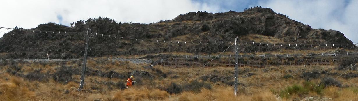 A number of different design approaches have been taken by the engineer in this project. Firstly, the larger rocks were scaled off from the slope surface so that the immediate threat was taken away. The residual risks of potential rock fall was then further controlled by installing an attenuator fence up the slope of Tower 6.